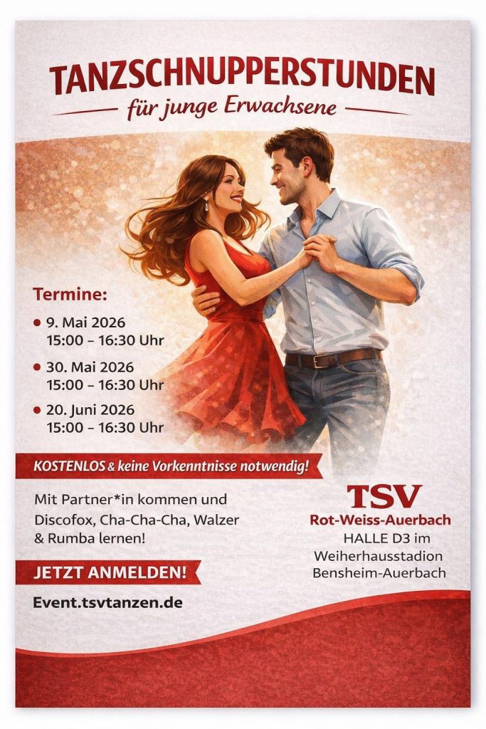 Am Sonntag, dem 19. April 2026, ab 18:30 Uhr, laden wir euch herzlich zu unserem Tanzabend ein. Egal, ob ihr Teil unserer Abteilung oder des Vereins seid oder einfach nur als Gast vorbeischauen möchtet – wir freuen uns auf euch! Lasst uns gemeinsam Spaß am Tanzen haben und einen unvergesslichen Abend verbringen. Der Eintritt ist natürlich kostenlos. Wir freuen uns darauf, euch zu sehen!